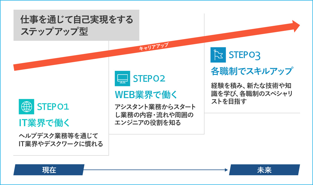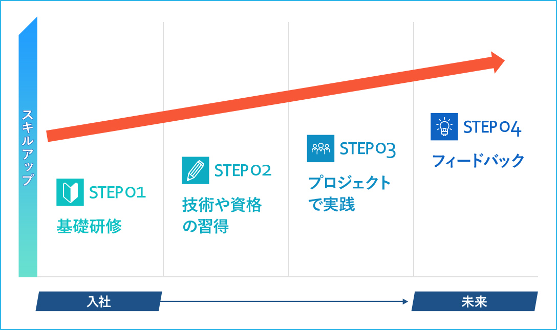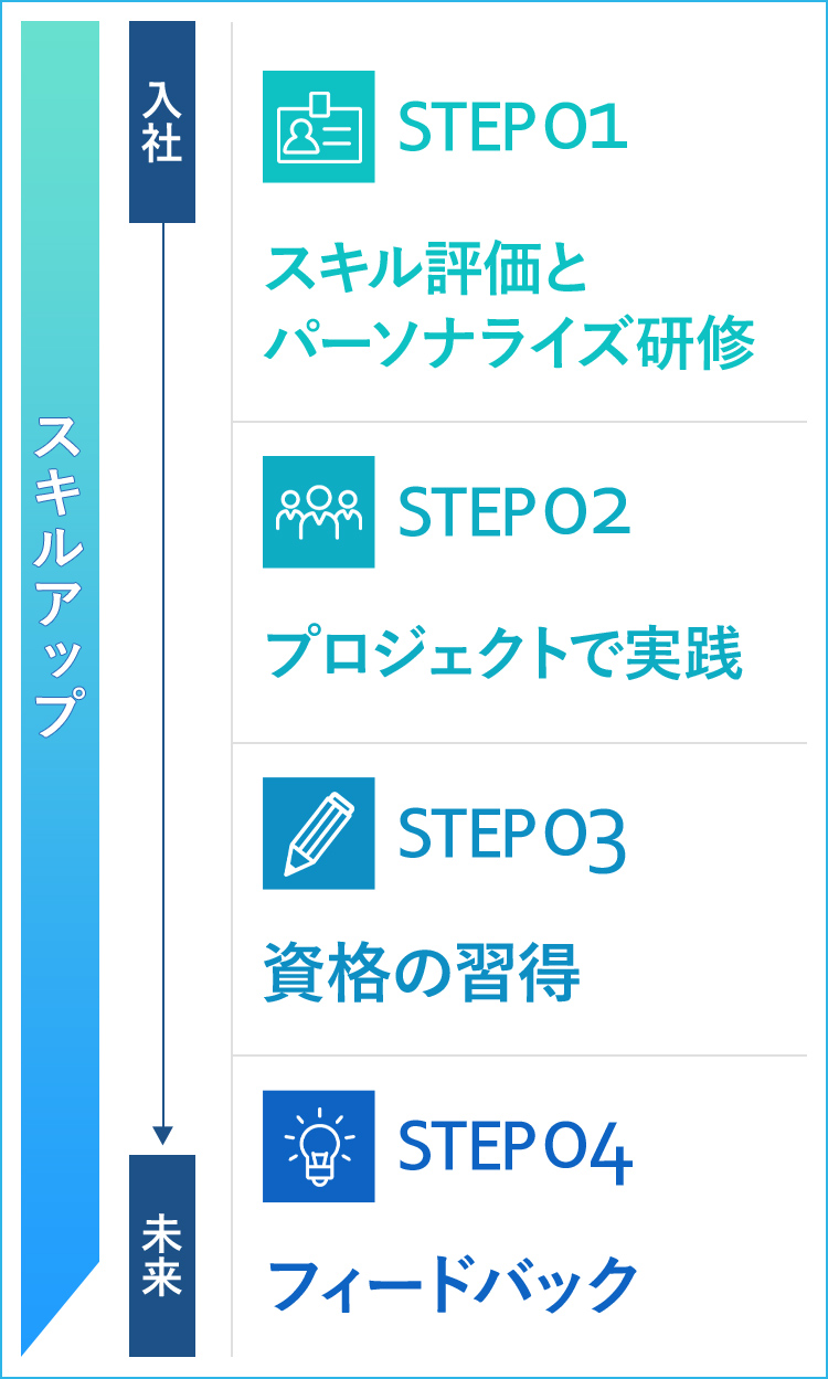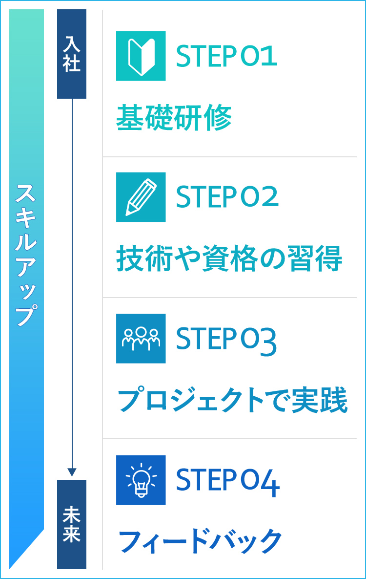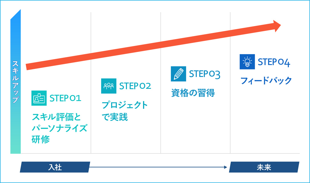 未経験者の方はITやWebの基礎研修から学び、次に具体的な技術や資格の習得に移ります。この段階では自身のやりたいことに特化したカリキュラムを学び、実際にプロジェクトで実践してさらにスキルを磨きます。