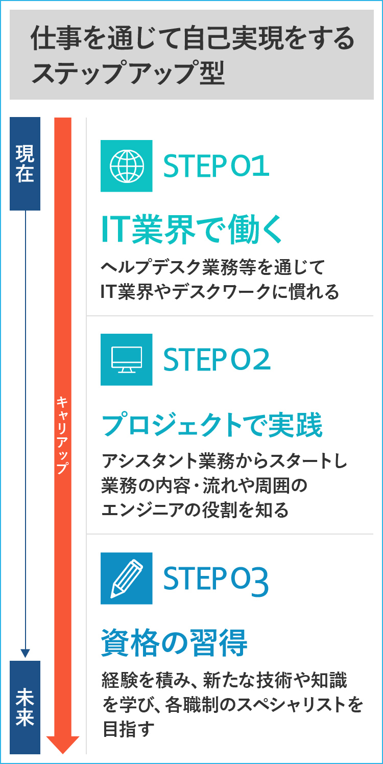 それぞれの技術者が抱える可能性を最大限に引き出し、夢や目標の実現をお手伝いすることが、私たちの最大の喜びです。